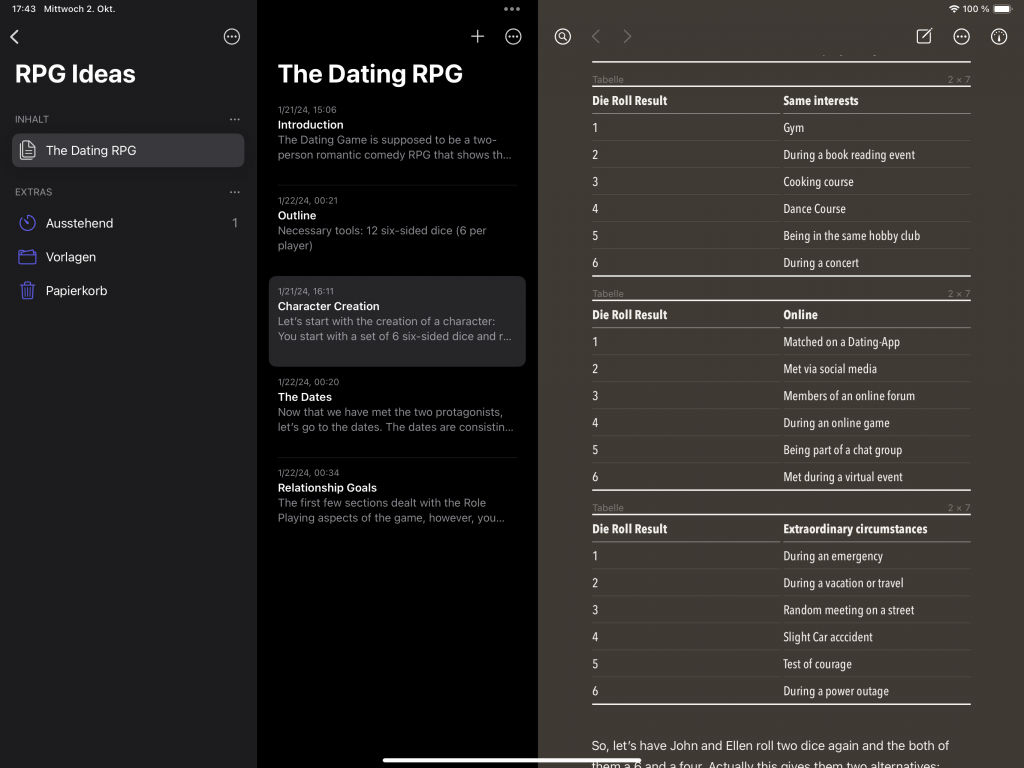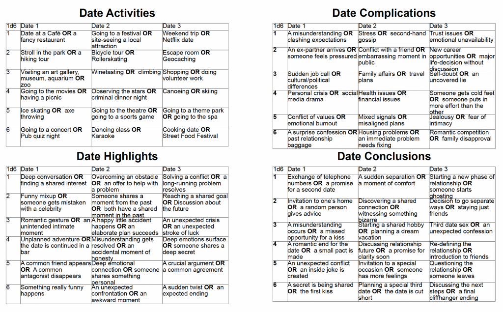 This was the final kicker to bring back my original manuscript for something that I had in my notes archived as „The Dating RPG“ or „The Dating Game“. Inspired by the Hope & Fear mechanic in the upcoming Daggerheart RPG, I included a simplified Dream & Nightmare mechanic that would bring more chaos into a date. The next few weeks I spent on refining the texts, examples and the overall design. Then, two weeks ago, I had a first gold master ready and had a first test run with my friends. The session was a blast, however, several things came up. For example, I had a fixed table for all three dates and it looked like this quite static and stale. And they wanted it in German. Because there was one thing that I didn’t anticipate. When rolling the dice pool, they already had a look at the last column for the date conclusions for the third date. They looked at it and basically tried to save one die throughout the entire game just to have their wishful ending. Of course that thing was „Third Date Sex“. But that’s not the point of dating, right?