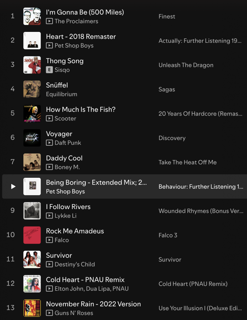 So, most of all Pet Shop Boys, Dua Lipa, Daft Punk and some songs that might surprise some of my friends and family. But just during this very first playthrough, it reminded me of my uncle who did those radio shows on free local radio channels … and to some degree to what I did with movies at the university.