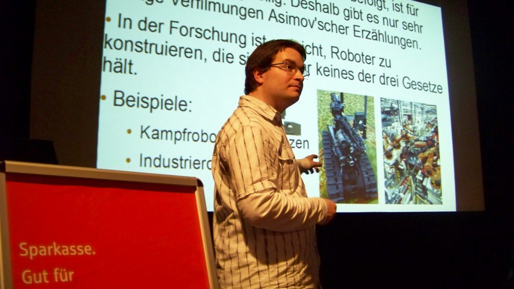 Back in the mid-2000s, I was at Saarland University and at some point I was in a lecture course about Artificial Intelligence. Prof. Dr. Siekmann proposed to do a film series with a local cinema about movies that dealt with A.I. And this turned out to be an interesting experience not just how to organize a film series, like getting film rolls, presentation rights and getting permissions to show a movie from estate rights holders. We also had talks with sponsors, created press release messages and at the day of the movies, we had a fifteen minute talk before each movie, discussing the topics and current state-of-the-art research results. I think I had a few talks but the stuff that I could save from that time was a presentation about I, Robot and Terminator 2. Since this was the last movie for that year before Christmas, I wanted to end with a bit of a laughter and made a „How to survive the Robot-Apocalypse“ talk. Let’s just say, if 2008-Kai saw today’s developments in AI and robotics, he would be more afraid than whimsical.