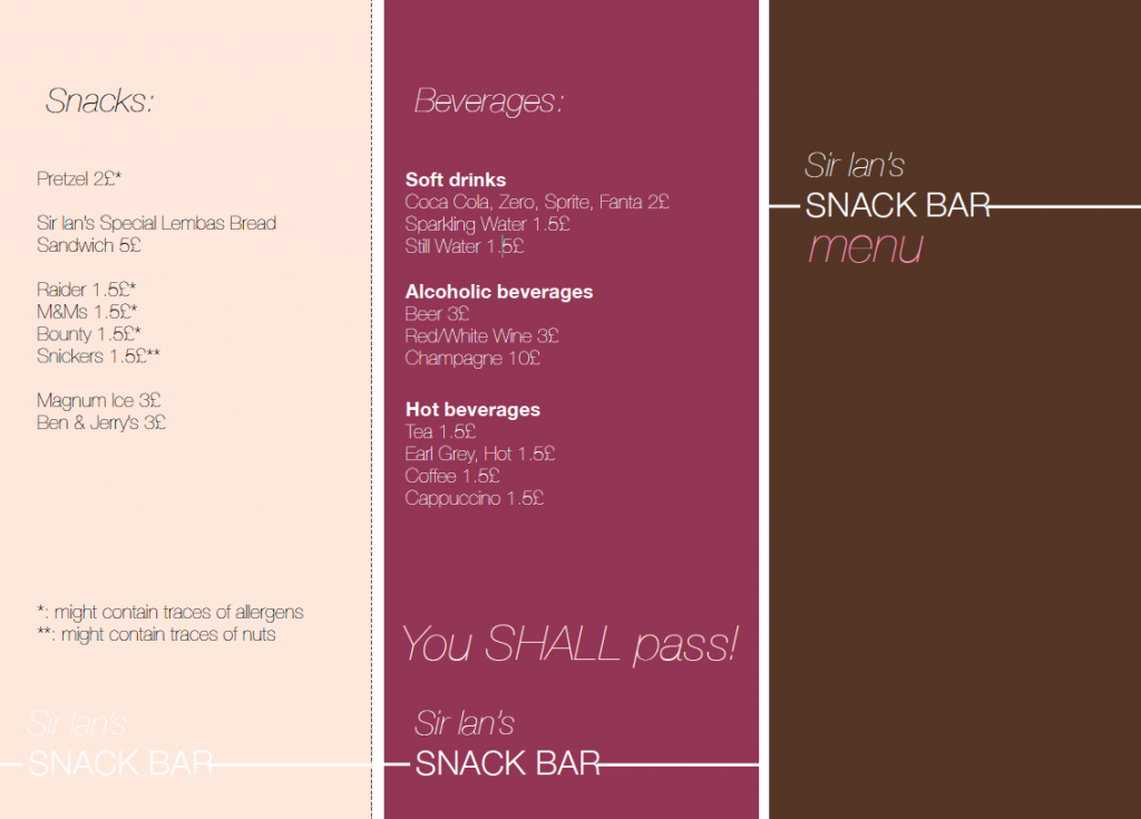 There are three snack items that made it special, because they were not likely for players to actually buy them, but they could have an actual effect. Inside the theatre was an employee that had a serious allergy against nuts… and one of the players actually bought the Snickers bar and used it later to get the keys they need later to open up a locked door. The Special Lembas bread gave them additional temporal hit points and the Raider basically gave away where this game was taking place: The parallel universe where Raider hasn’t been renamed to Twix. Furthermore, I handed my players the following documents as well.